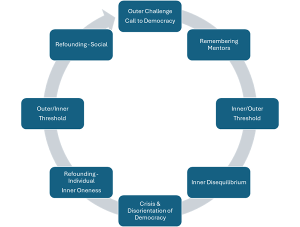 This loss can happen internally, for example falling off the practice, or it can happen from external events which disturb outer democracy. This inner or outer disturbance or disorientation can spark the individual to a deeper personal calling to further develop inner democracy to meet the outer challenge. Inner democracy is a practice as there are so many daily experiences in society that pull us from We to Me.