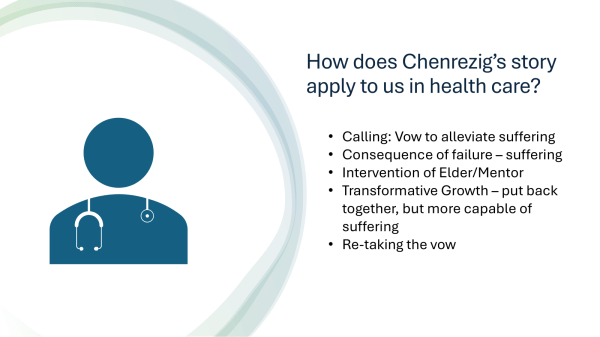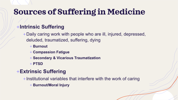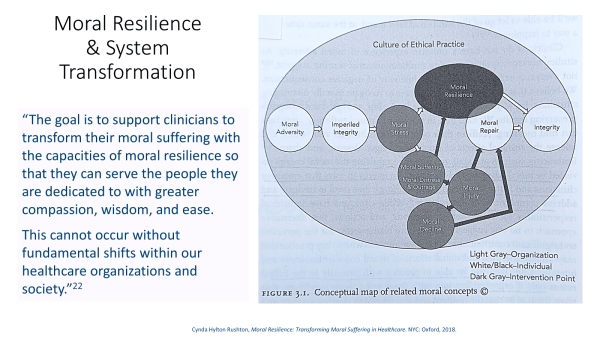 DRK: I wonder whether we should institute practices, like some type of idealism practice and some type of suffering practice? A practice of being able to hold on to these ideals and recapture or regenerate them if they are lost. And a practice of being able to accept and embrace the suffering inherent in our professions and our work with people who are suffering and to be able to have a framework to metabolize and grow from that suffering―to turn the suffering into commitment to action in the world or re-dedication.