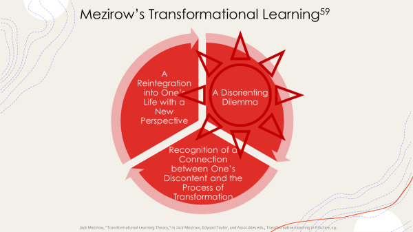 Jack Mezirow describes transformational learning as requiring a “disorienting dilemma” that sets the learner on a path of transformation in who they are, not just in learning objective data or facts. The journey of transformation requires some form of inner or outer struggle.