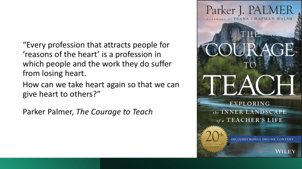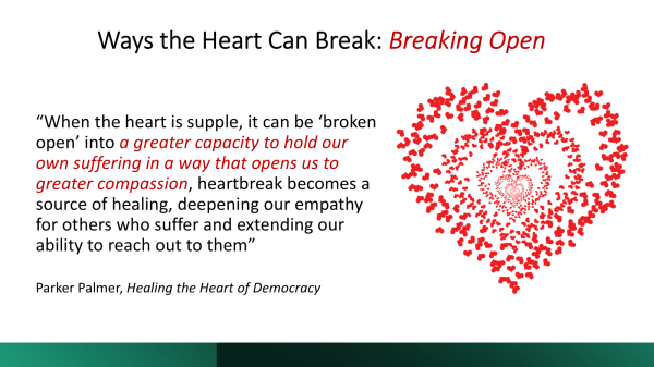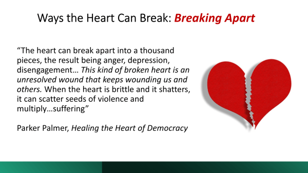 As Parker Palmer has written, in Healing the Heart of Democracy: The Courage to Create a Politics Worthy of the Human Spirit (2011),