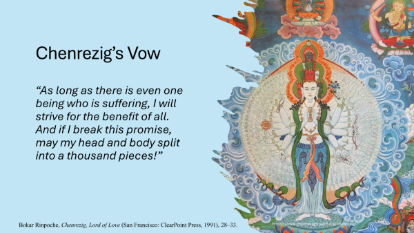 Rigdzin: The biggest issue is you have to always exchange places. Like, in the West, you say you have to put yourself in another’s shoes. In every aspect, not just torture, not just politics, even lust. They’re being taught as a monastic, that you have to think this is someone’s mother, someone’s sister, like that, right. And even that cannot sometimes put a stop to one’s own mind. So, you might have to analyze, if you imagine taking the skin off a person, they will be not desirable, right? If you look into the stomach, it’s not desirable. So of course, it’s very easy to say, but I’m saying, in every respect, we have some sort of exchange, equilibrium, and exchange oneself for the other.