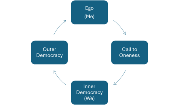How does the journey of inner democracy start? Something happens in life, a calling, a disorientation, an experience in nature, a tragedy (in one’s life or in the world), a stirring of the heart. Something happens that helps the individual shift from an identity of Me to We. Once this transition or transformation from ego to inner democracy occurs, outer democracy follows.